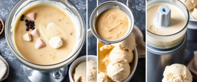 The process involves making a custard base, chilling it thoroughly, then churning and freezing.
